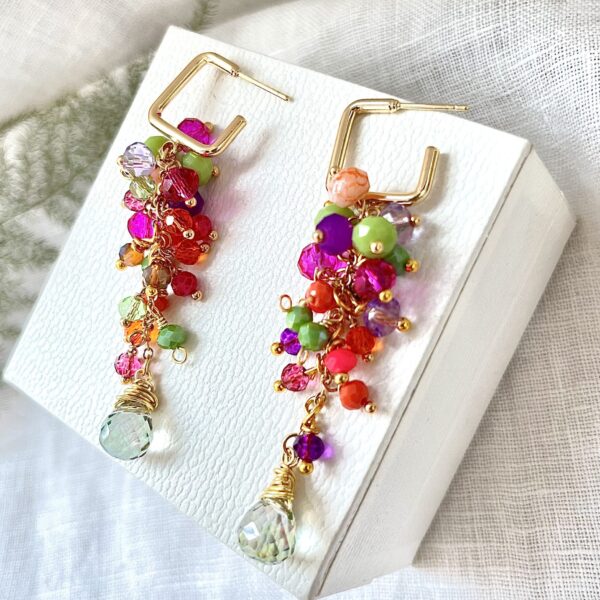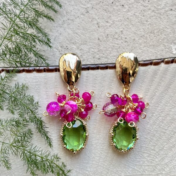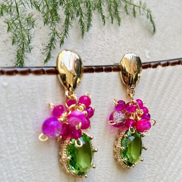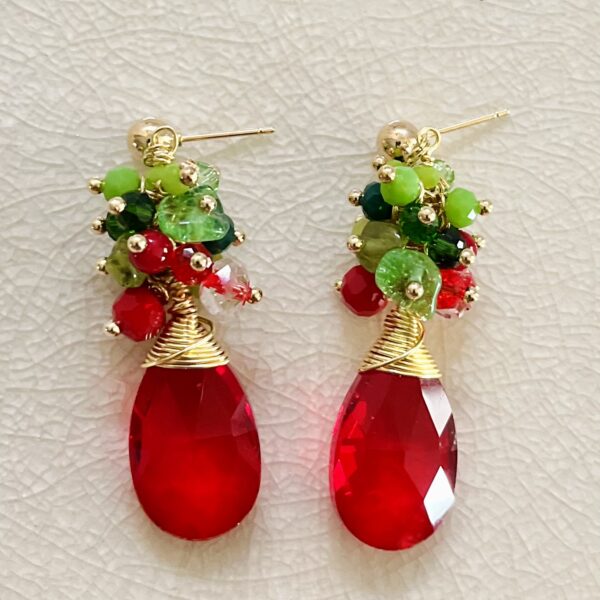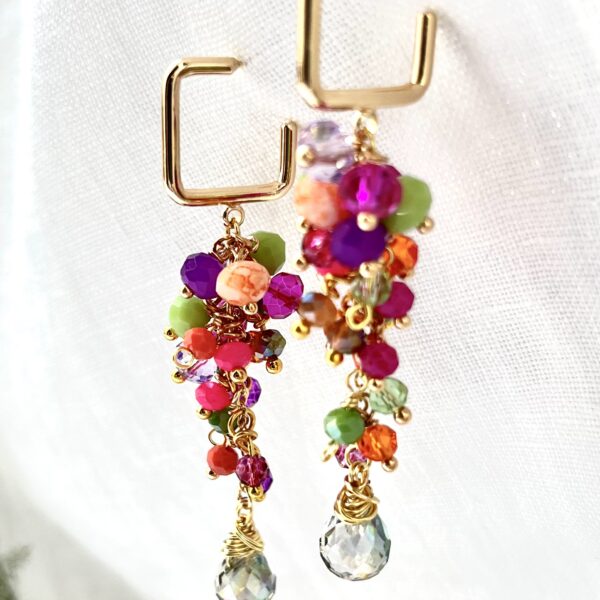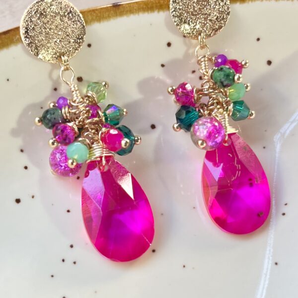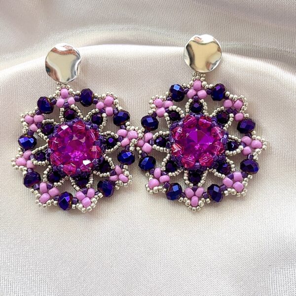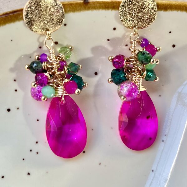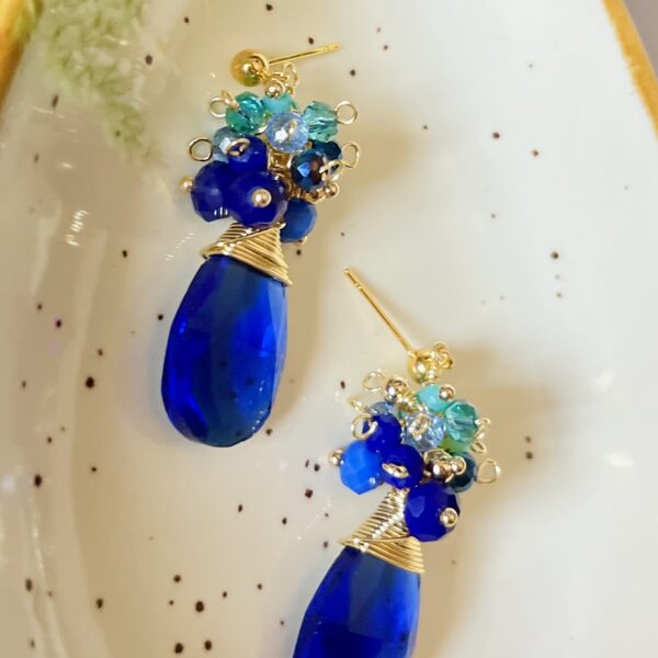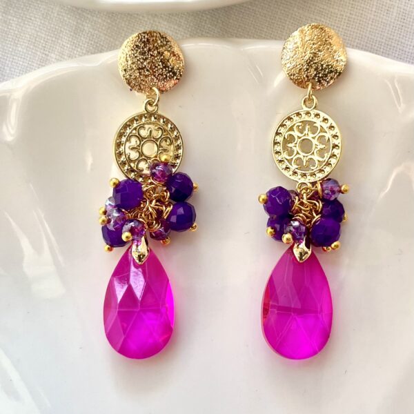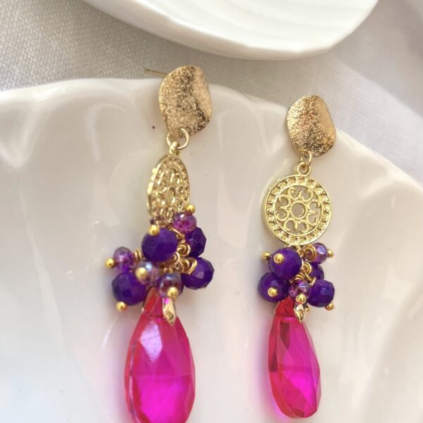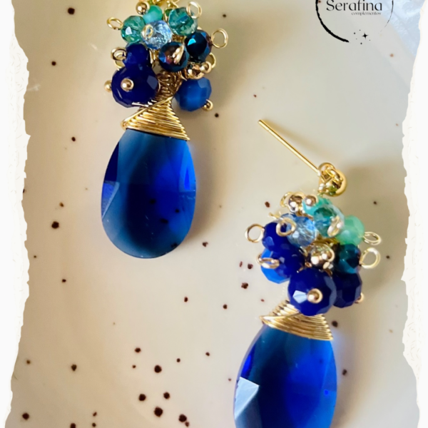 Realizado con tejido de cristales y colgante de lágrima junto a aplicaciones doradas.
