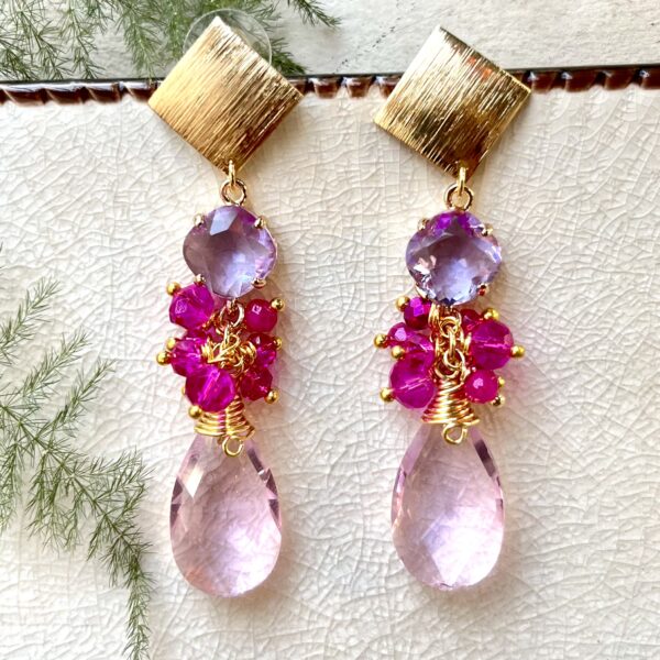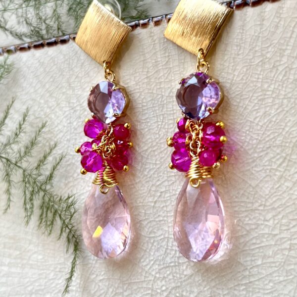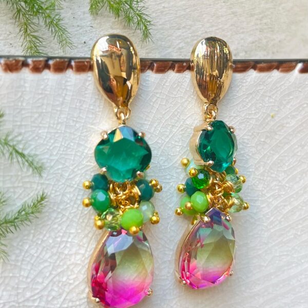 Muy románticos, realizados con cristales en tonos rojizos y verdes, pasador enchapado en oro. Mide 4 cm de largo.