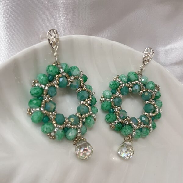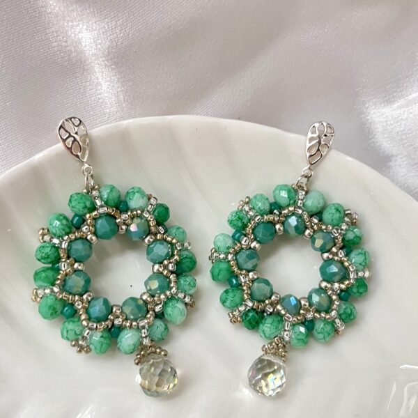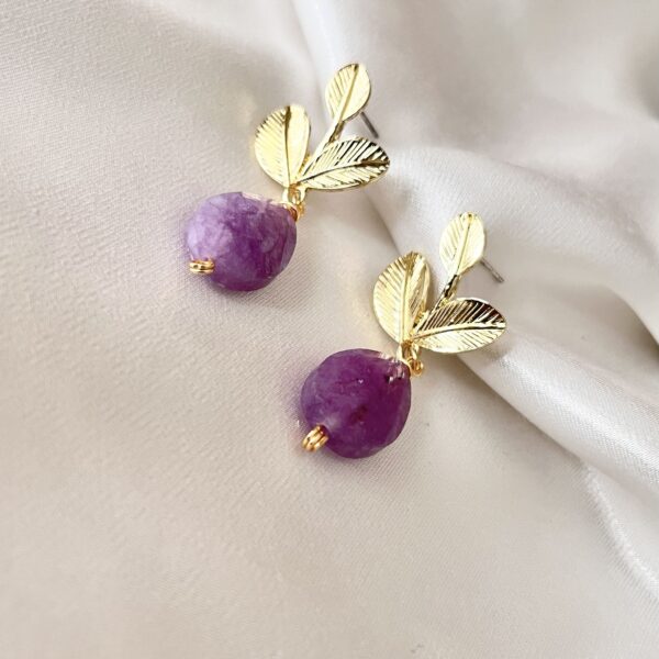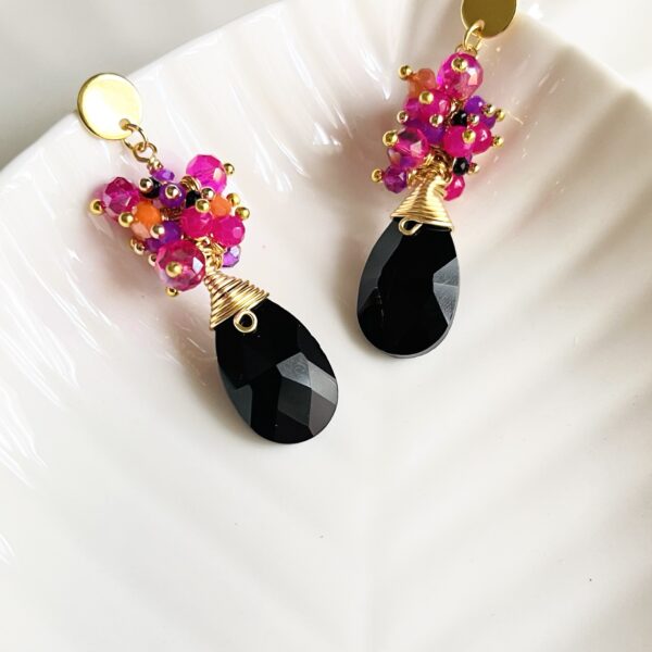 Una tentación estos aretes llenos de alegría y femineidad. No pueden más de lindos. Cristales en tonos fucsia y morado. Aplicaciones y pasador doradas.